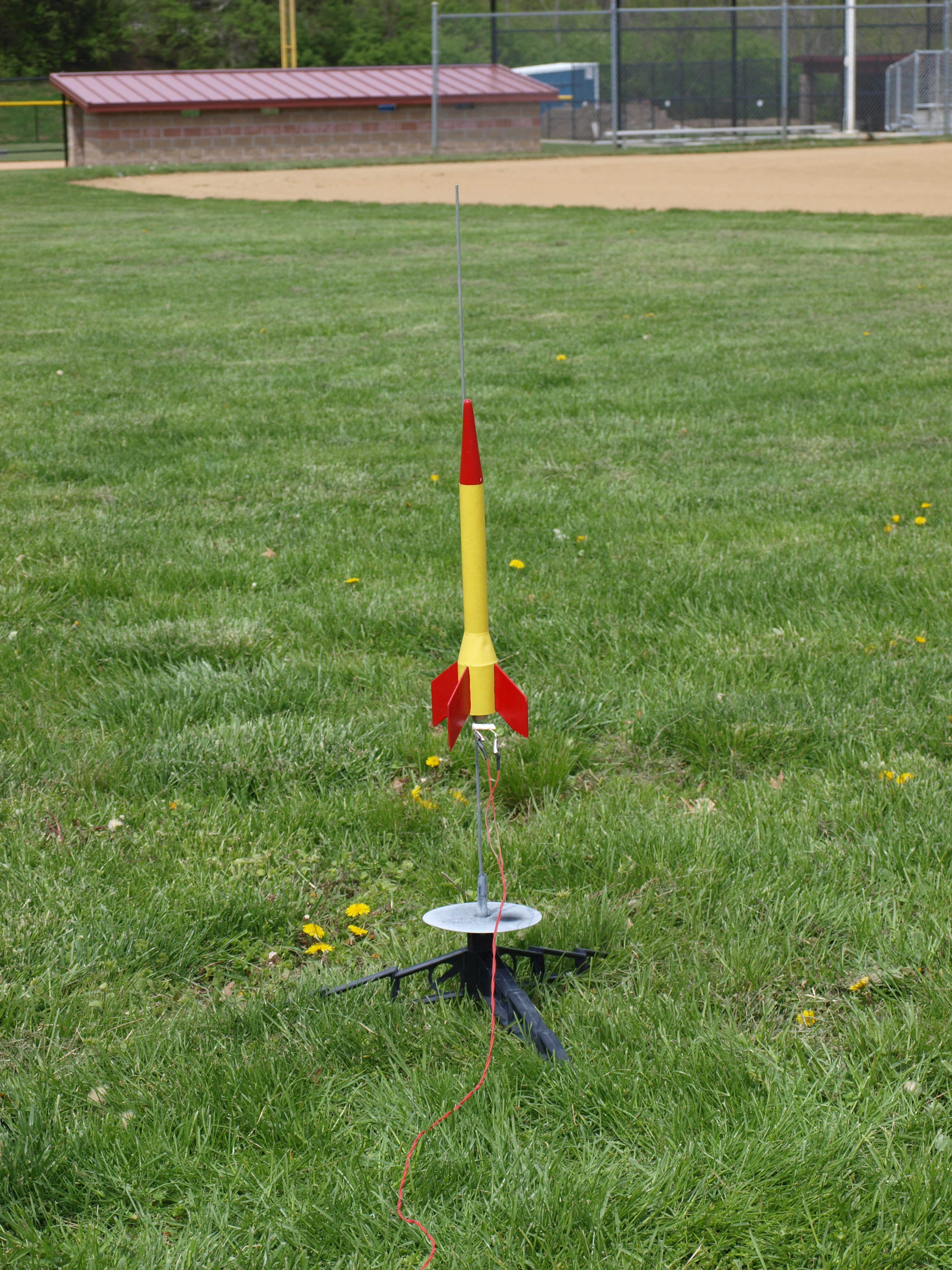 First flight of this Ebay refugee.  Straight up A8-3 flight with a serious issue on recovery.  Shock cord tangled around the fin can of the rocket.  Chute fouled, but the grass was soft enough to prevent any damage.