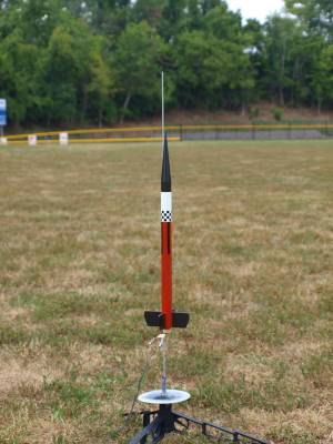 Great flight.  High for this field, and dead straight, but I could hear the thunk of the nose cone hitting the top of the body tube at ejection.  Got a nice Estes dent for my finishing troubles, with four feet of Kevlar and elastic shock cord!  Popped out easily, but it will never again look as good as it did in the picture.