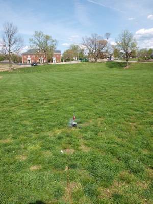 Took a while to get going, probably due to the batteries in the launcher. Left the pad with authority, and both pieces recovered within 100 feet of each other. Engine section was hot to the touch, so much so that it melted the glue fillets and the engine was stuck. I let it cool down and the motor slid right out and the glue hardened again. Something to watch in the future.