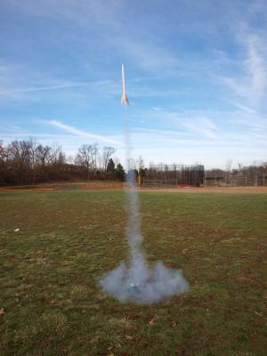 Chip shot. I can throw a rocket this high. Should have gone with the B6-4, but the breezes and the treezes had me cinched up. Landed about five feet away from the pad.