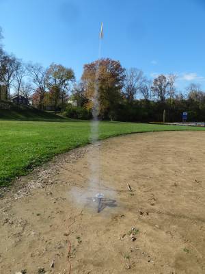 High, straight flight with shotgun ejection charge. Rocket recovered without damage near the pad on the soft dirt of the infield. Both nose cone and body tube stuck the landing.
