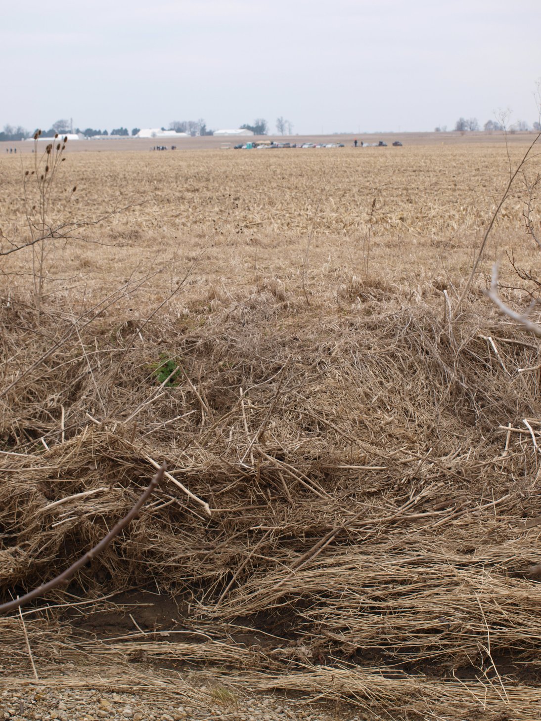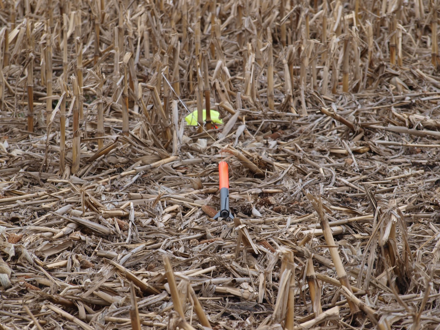 Hoping it would windcock off the pad, but the flight path was as dead straight as you can get in 13 mph wind. Wiggled on the way up, so some nose weight might be necessary. Entered the clouds quickly and no one ever saw it after that. I walked across the corn to the edge of the creek and was about to turn around when I saw a flash of neon orange on the other side. I found a spot that looked crossable, and actually made two of the four steps necessary to cross it without getting wet, but the third rock rolled as I stepped on it and I was in up to my shins. Yeah, my feet were cold and wet, but I got my rocket back.