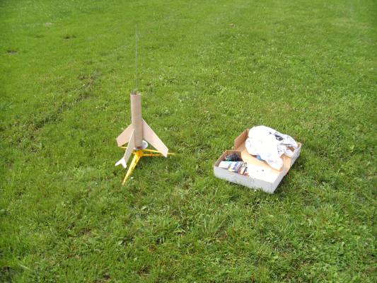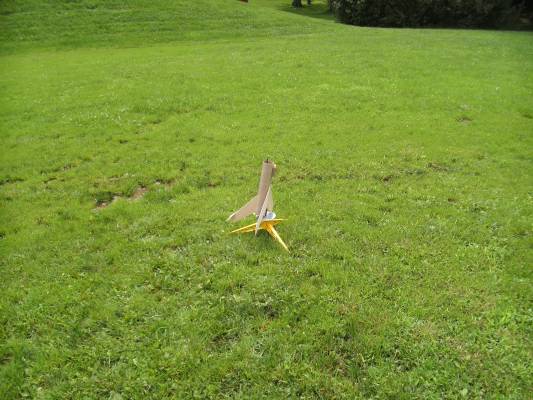 Test flight for my next camera adventure using an engine that should have been better suited for the field. Left the pad and headed straight for the trees near the edge of the field. Popped the marker cone and flew straight into the highest branches. It should blow down some time in the next day or two.