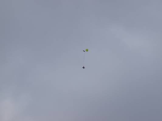 Windcocked off the pad as expected. Actually disappeared in the cloud cover for several moments, but was spotted by several sharp eyes as it descended. Comparitively short recovery walk.