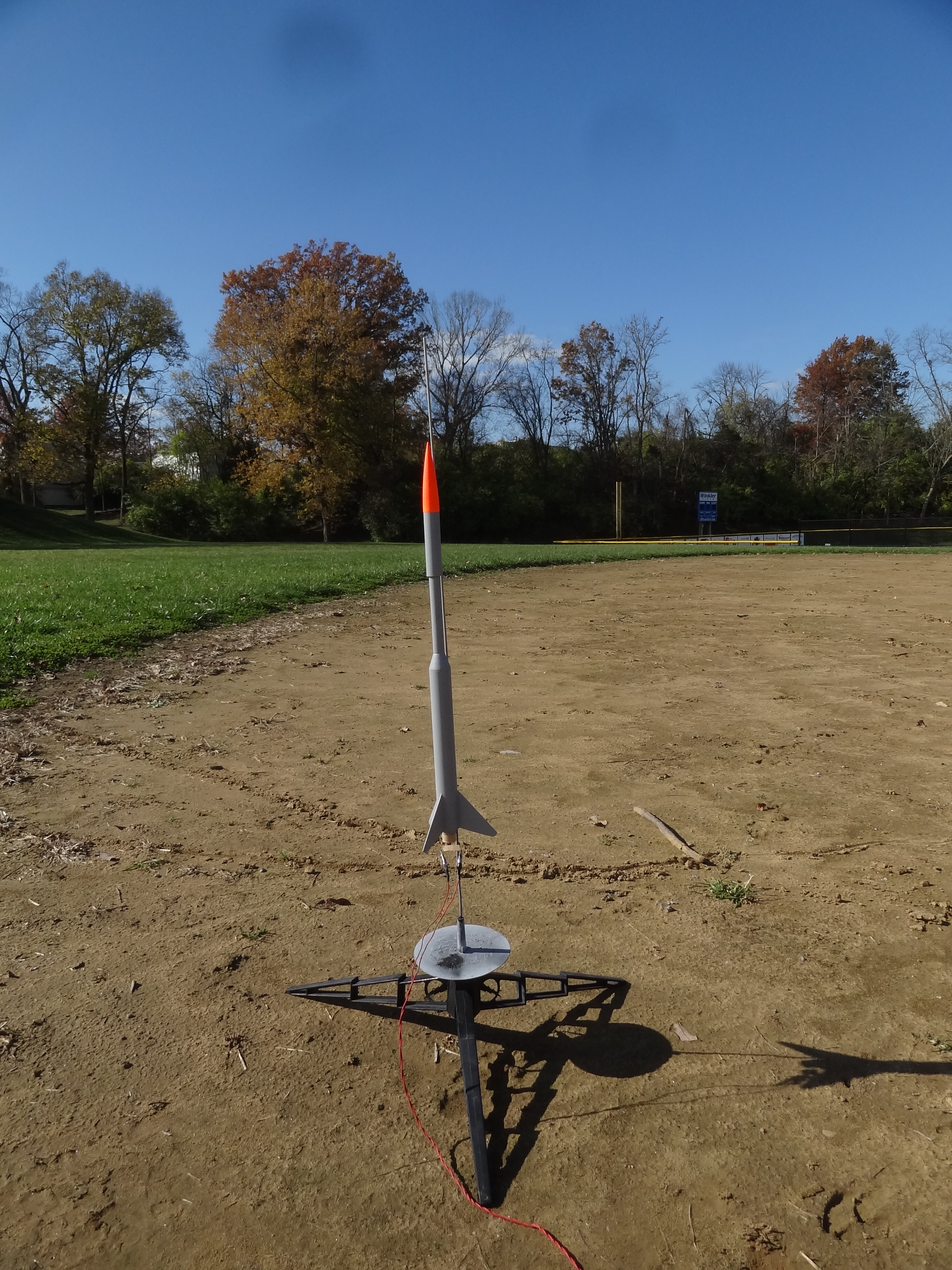 High, straight flight. Impact heard at ejection. Recovery in left center. Rocket was missing a fin upon landing.