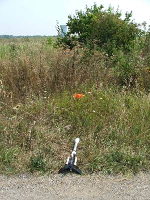 Looked great flying alongside the Semroc SLS Laser X prototype, but the big Taurus found the road again. One fin is delaminated and shattered, a pod was sprung and crushed, and the upper body tube was damaged.