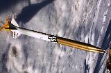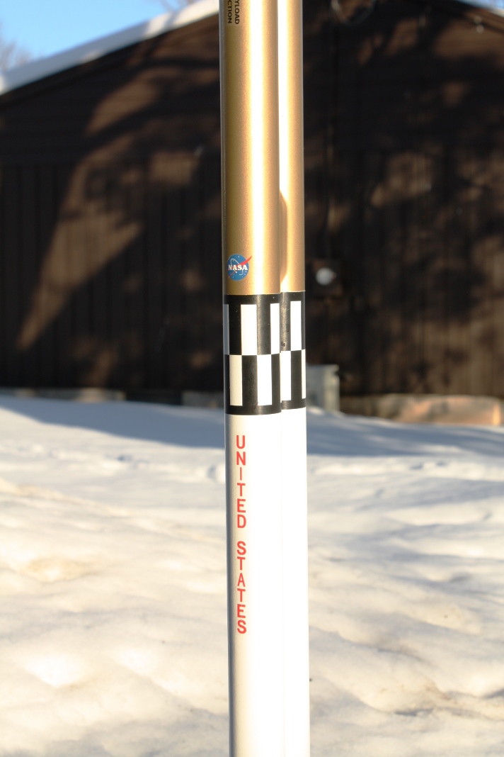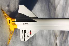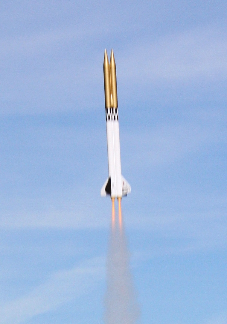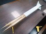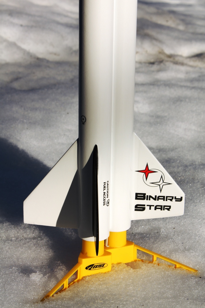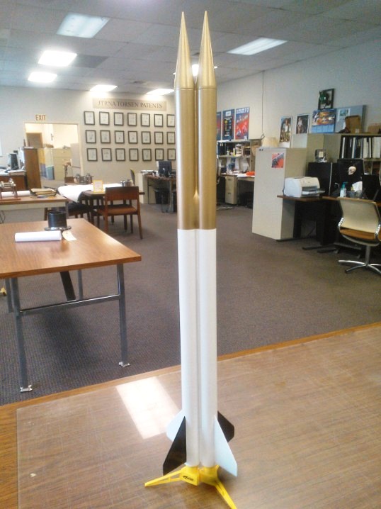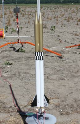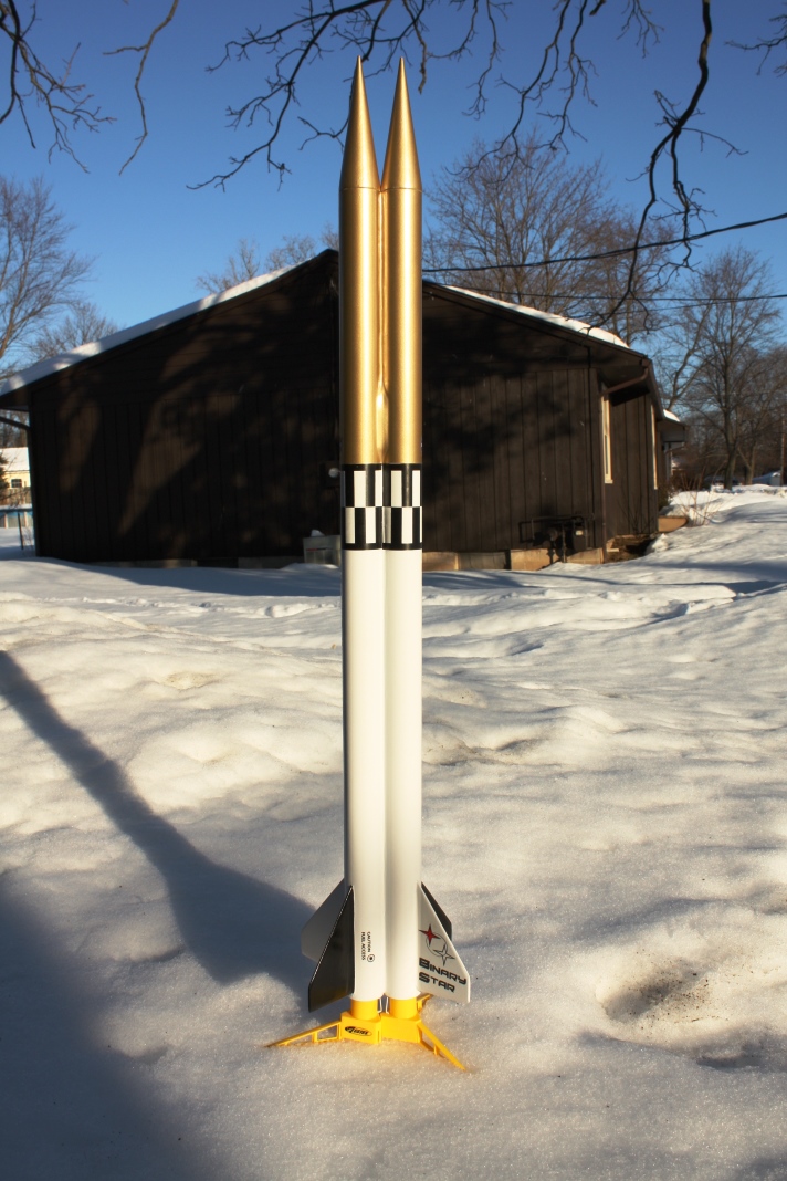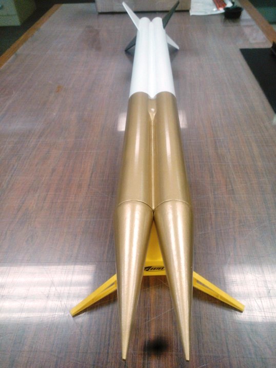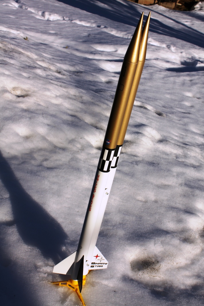 Originally started as a quick & dirty cluster rocket, this is basically a pair of BT55 tubes strapped together with one set of fins. Two 24mm mounts, two pointy nose cones. Payload bay on one side, parachute on the other. I'll probably try to have some decals made for it yet.