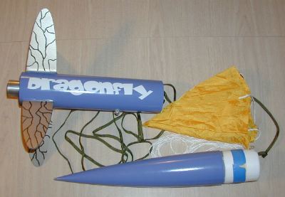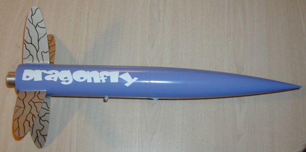 [Picture] (09/10/02) It is always nice to see a little uniqueness in rocket designs and that is exactly what Binder Designs' new (for 2002) Dragonfly has. Its fins, length and finish recommendations are all to help it look like a Dragonfly. According to Binder, the kit is "geared for the beginner to mid/high power". I would agree, as it is a very straight-forward kit to build. But Binder also says that you can "expect about 3,000 ft. on a G motor" so, for those folks that like altitude, the Dragonfly will meet your needs too.