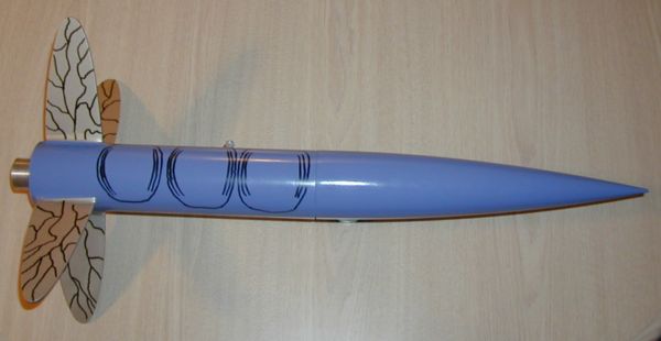 Picture Courtesy of Binder Designs Single stage with four fins placed not at 90 degrees to each other - to mimic a dragon fly. The kit consisted of (1) paper body tube slotted for fin placement, a nose cone, plywood centering rings and pre-cut plywood fins (fins are mounted to the motor mount), a 29mm paper tube motor mount, a fin alignment guide, the Dragonfly decals and CP, CG ...