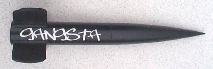 After construction was complete I used Elmers Carpenters Wood filler to fill the fins and the body tubes shallow spiral grove. This was followed by two coats of Krylon white primer, sanded in-between coats, and a final coat of Rustolium gloss black. The finishing touch was the large vinyl Gangsta decal. The decal was very easy to apply and looks great.