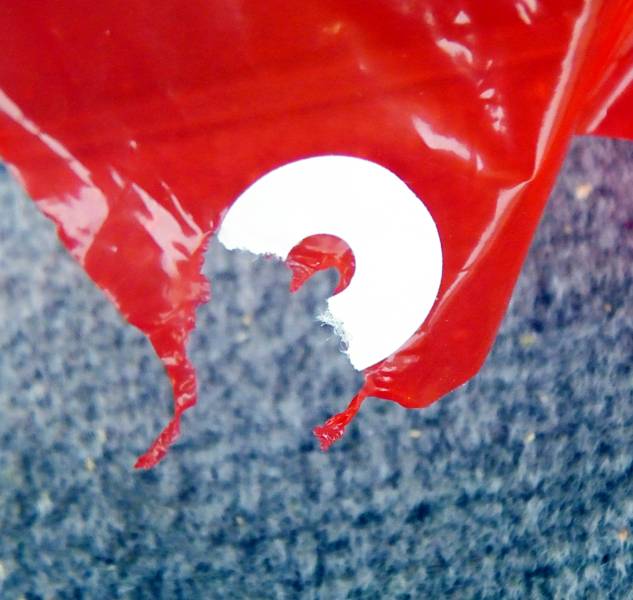 Binder reinforcement rings are no match for a thin string shroud which can cut right through them on a hard deploy. This was a stock Estes parachute. This occurred at 747 feet with my favorite "show" rocket. Fortunately, the other five held, but several times I've seen all six rip off, leaving the plastic to flutter away in the wind. When I make my own custom parachutes, I use vinyl (electrical) tape that seems to hold up much better, and it comes in colors to match the parachute.