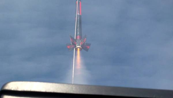 On a perfectly clear afternoon, the Estes Black Diamond lifts off on it's way to a record-setting speed of 217 mph using a C6-7 motor. The haze you see is the exaust cloud.
