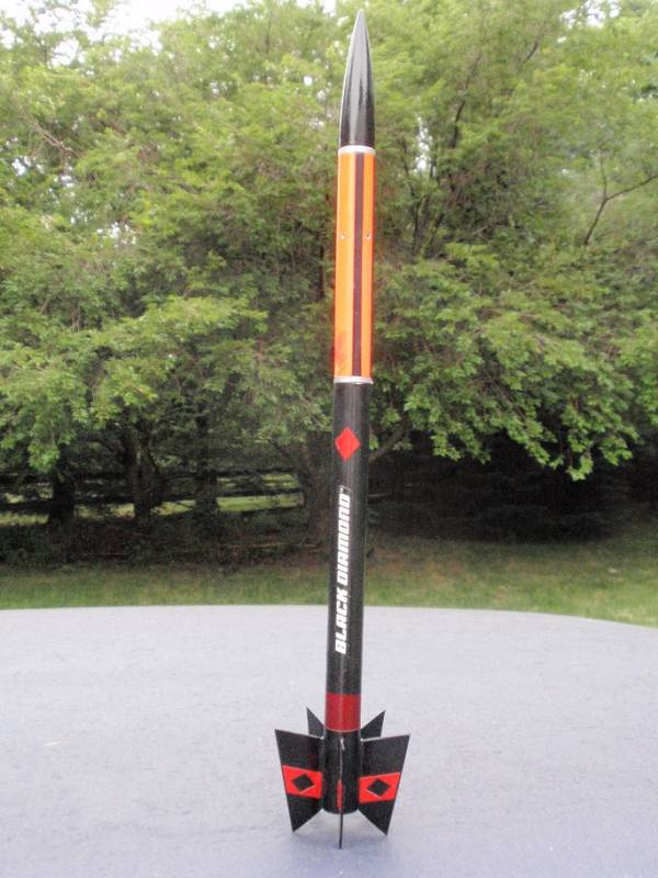 Black Diamond with Iris PayloadThe Iris payload tube provided the opportunity to add a bit of color to this rocket, making it easier to see on the ground, since it is so light it can easily sail out of sight on a B or C motor. This model has a lot of noseweight, and its length would make this rocket very over stable, if not for the small fins. |