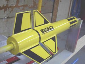 When the build was complete, all the bodytube spirals and woodgrain were filled with Elmer's Fill ‘N Finish prior to primering. I chose to go with the stock color scheme, so the booster section was painted yellow and the altimeter bay and payload section were painted black. Once the paint was dry, the decals were put on. Decaling was a real pleasure, as BSD's decals are top notch. Once the decals were applied, the rocket received a clearcoat finish. The finished rocket gets a “10" on the gawk scale