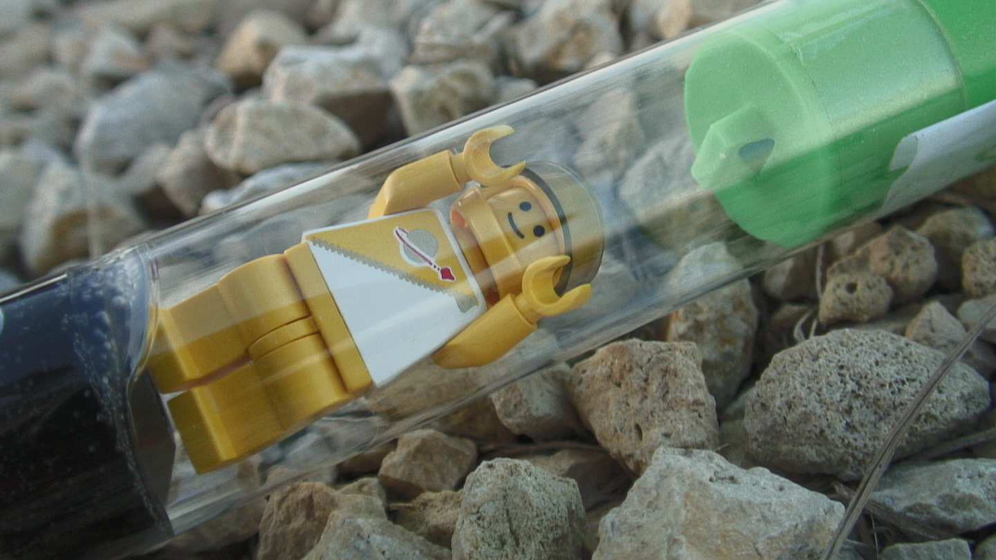 Failed launch attempt after igniter burned against post, but did not ignite rocket engine. Replaced. Launch successful with Lego astronaut aboard instead of camera.