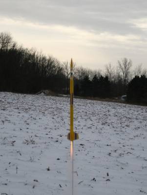 First Flight, was a good launch but the chute lines tangled on the motor hook on deployment and the chute never opened. Landing wasn't too bad considering, one fin broken off by the frozen ground.