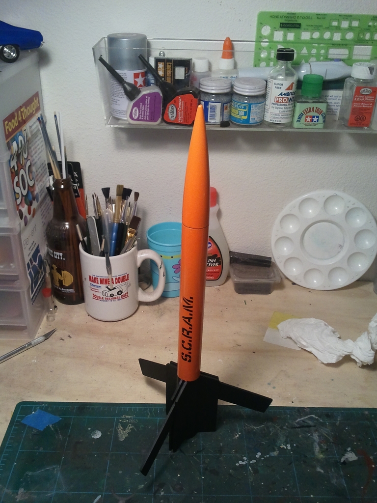 This is a BT-50 upscale of the S.C.R.A.M. from Estes Mini Tri Pack. The rocket is powered by standard 18mm motors and comes down on a 12" chute. Since I was doing a whole "SCRAMily" of these rockets, I chose a non traditional paint job, going with an orange and black scheme for this one.
