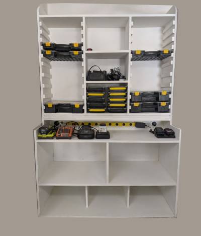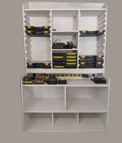 I am really pleased with the result. Having my collection of screws and other small parts organized where I can quickly find them is going to make life easier. And having a place to charge the batteries for my tools frees up a lot of space on my workbench.