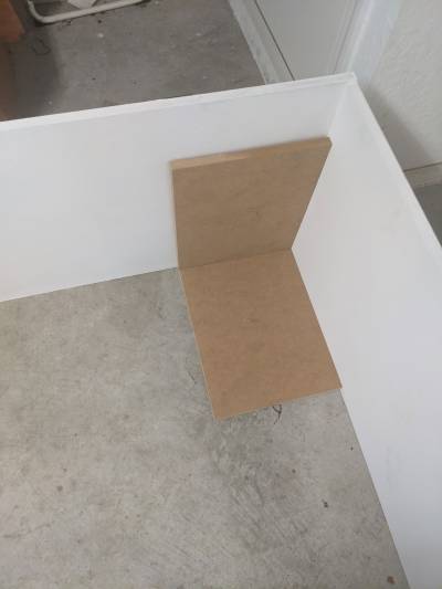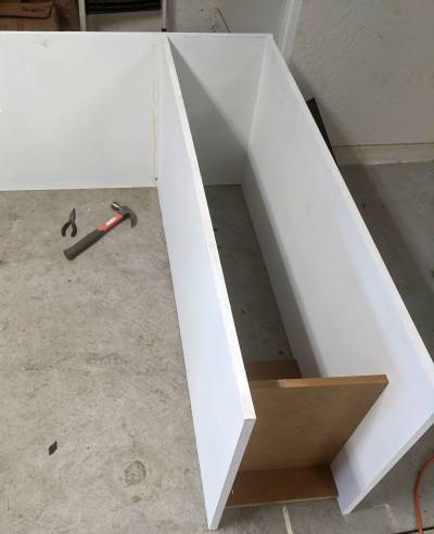 I cut several 1x2" boards into rails to hold the storage boxes and used glue and an nail gun to attach them to the side panels.