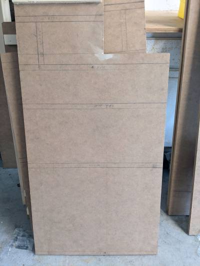 I started by purchasing a few 4x8 sheets of 3/4" MDF. I used Kreg's Accu-Cut and Rip-Cut guides with my little Worx circular saw to cut the MDF into the pieces I needed. On the two side pieces, I refined the design a bit by drawing the layout of the shelves and dividers directly onto the wood pieces.