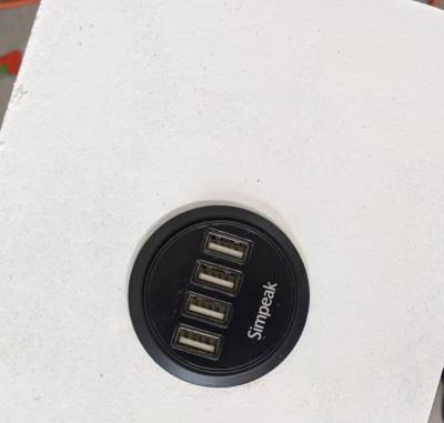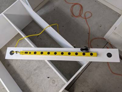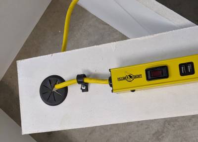 I attached a power strip to the back wall behind the charging shelf. On one end of the panel, I used a plastic grommet to cover the hole for the power cord. At the other end, I added USB charging plugs (because it looks cool and because I forgot that the power strip has two USB outlets).
