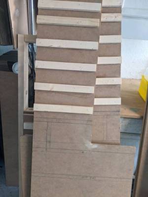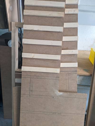 Rather than carefully following the measurements in my rough sketch or the layout that I had drawn on the sides, I cut out pieces to use as spacers since it was more important that the distances on each side of the unit matched than that the distances were some specific values.