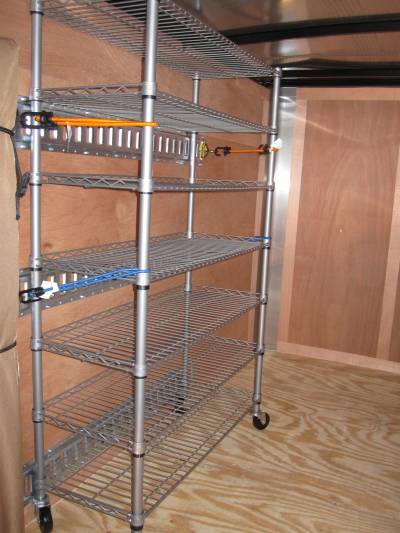 For our store items, we bought a shelving unit which includes bins from Sams Club. The shelves just fit through the trailer door. We used bungee cords to the e-track hooks to hold the shelving unit to the wall of the trailer. A tarp over the front of the unit holds the bins in place during travel. A couple of wide bungee straps keeps the tarp tight. On site at the launches, we just pop off the bungee cords and pull down the tarp to get to the things we sell.