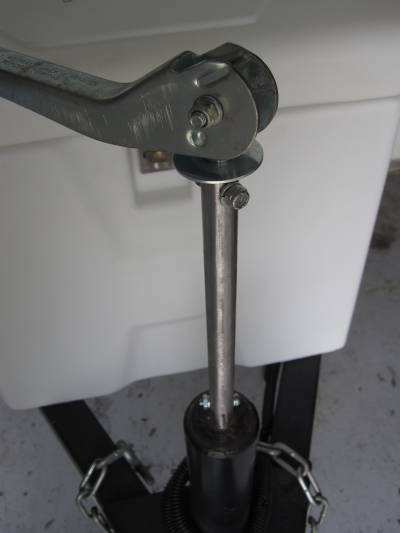 Test-fitting the box on the tongue, I discovered a problem. The handle on trailer's jack hit the box when you turned it. To solve the problem, I extended the rod where the handle attaches. It turned out to be a challenge. I couldn't find a heavy, strong pipe with the right inside diameter. So, I bought a pipe with too small an inside diameter. I put it in a vise and used a drill to ream it out. I discovered that a drill stuck in a metal pipe can generate a very large amount of torque. I switched to a much slower, but safer, method of using a round file attached to the drill to gradually enlarge the opening until it was the right size. I drilled holes in the pipe and cut a short length of 1/2" diameter rod to complete the handle extension.