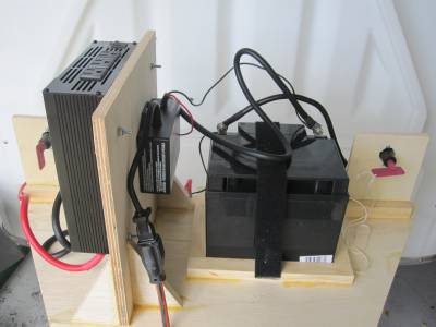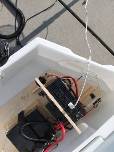 I built a wooden frame to hold everything in the tongue box. The box is bolted to the tongue and the wooden frame is bolted to the box. While I was attaching the box to the trailer and the frame to the box, I plugged an electric fan into the inverter and used it to keep cool. It ran for several hours while I worked on the trailer.