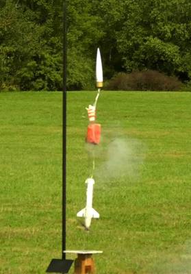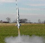 This is the standard Estes Bullpup 12D kit, modified with a small payload bay between the forward fins and the nose cone, and a engine mount pulled slightly rearward to allow for a metal spring-clip for the motor. It is internally modified with a Kevlar shock cord mount and a much longer shock cord.