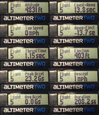 Flew with AltimeterTwo, reported 4831' apogee, 0 mph max (??), 15s to apogee, 208.2s total flight duration.