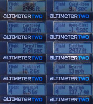 Flew with AltimeterTwo, reported 2496' apogee, 314 mph max, 12s to apogee, 137.7s total flight duration.