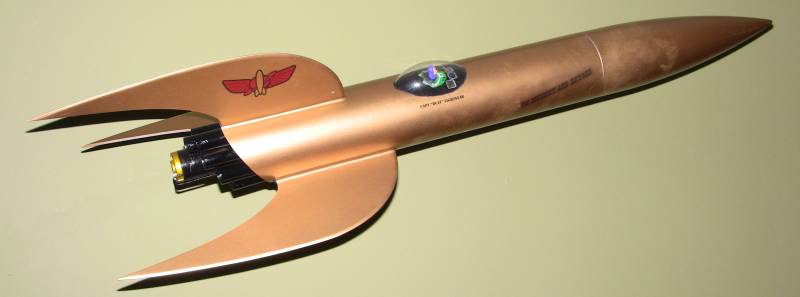 Slightly modified version of the Mid Power, Bucky Jones Space Cadet Rocket. I added a clear canopy and a figure of "Buzz" Lightyear from Toy Story fame.