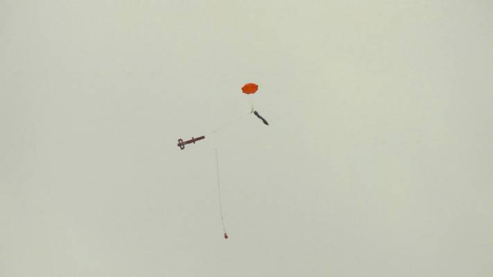 With its additional weight, it now is carried by two parachutes: a 19" and a 9" Nylon parachute. (The 9" is only for a redundant backup chute.)