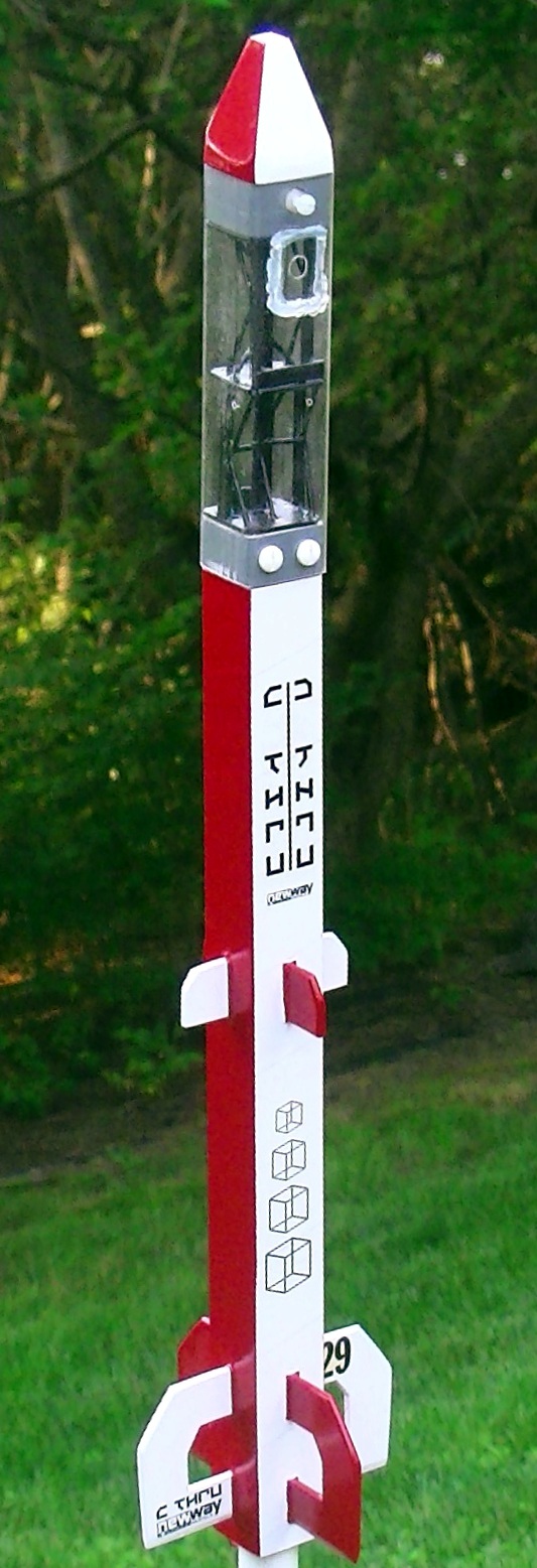 The distinguishing feature of this rocket, like all the kits from New Way Space Models, is that the body tube is square instead of the traditional round body. This is a D-powered payload rocket, capable of flying with larger E and F motors as well as a smaller C power. My particular rocket had the payload bay modified to carry a small HD video camera and an altimeter/accelerometer.