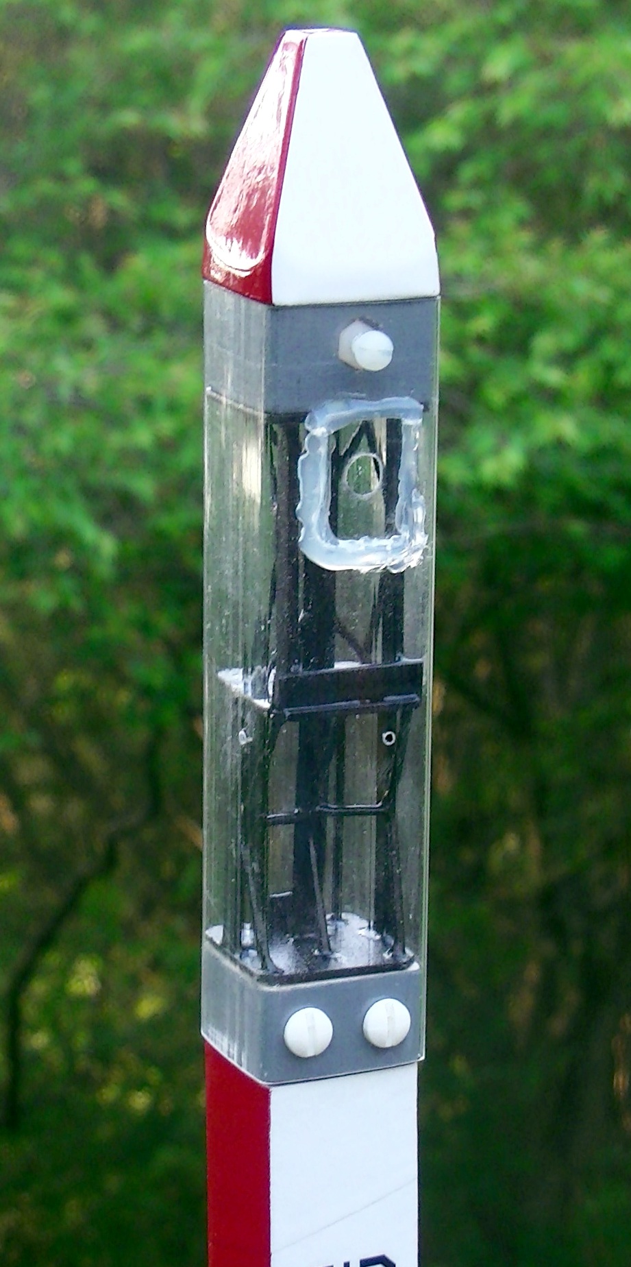 I chose this rocket to carry the camera because it can have considerable excess rocket thrust to compensate for the heavy (47 gram) camera. It also was somewhat short and has smaller fins which I suspect / believe will be more stable with the heavy noseweight. My previous camera booster was overstable, which I suspect contributed to somewhat blurry images from the motion, and a tendency to wind-cock and fly at a angle. As a bonus, the square sides of the payload made it easier to install a flat glass window. I had hoped that the clear plastic would be optically clear, but it blurrs and distorts the camera's view. Another bonus is the plastic screws that secure the bulkhead ("connector" according to New Way) and prevent a loss of the electronics. To this I added Nylon screws to secure the nose cone on top also.