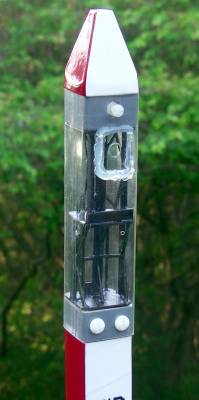 I modified the suggested black/white paint and used red and white to make it more visible in the air and on the ground, to help prevent the loss of a rather expensive payload. I did not use the gold foil supplied by the kit. The construction followed the stock kit, however I modified the clear plastic payload tube to carry a small glass window for the camera to "look out of", because the plastic created too much distortion of the image.