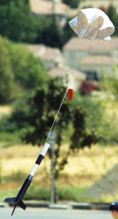 Just found this photo I took of this rocket recovering at Folsom, CA when I flew it with SARG. Took a guess on the motor used.