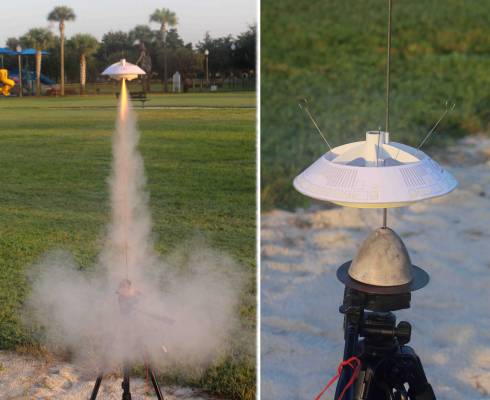 At the end of boost, it turned to the North before the ejection charge fired. This smaller saucer works as advertised - flipping over, floating down to an antenna wire landing.