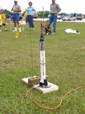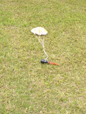 Since this model was built in early 2006, I've been able to fly it three times. The first flight took place at our Challenger 498 club launch at Rushing Park near Katy, TX on 5/7/06. I used a C6-3. The flight was good, although a bit wobbly during boost, probably because the model was marginally stable. At ejection, only the 12" chute for the Mercury capsule deployed while the 18" main chute never left the inside of the body tube. Probably due to very weak ejection charge of the C6-3 used.