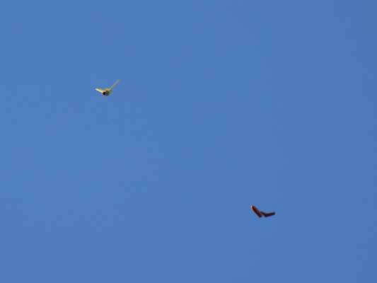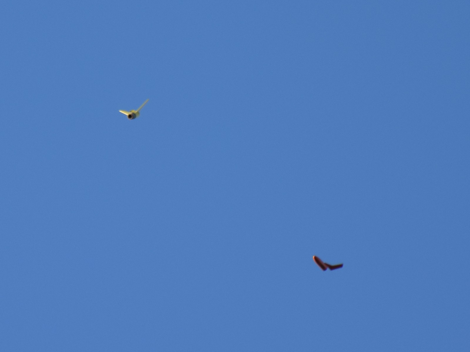 Despite the tiny engine, this tiny rocket went high fast. The upper section landed just short of the drainage ditch, while the tail section landed comfortably in the grass. I was gratified to see the upper section doing a definite "maple seed" spin on recovery.