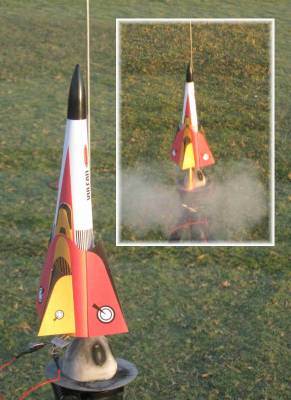 This was a re-build after a recent catastrophic B6-2 engine blew open the body at the nose cone joint. Today's flight was near perfect, getting much better altitude than I would have expected. Near apogee there was a little tailwag.