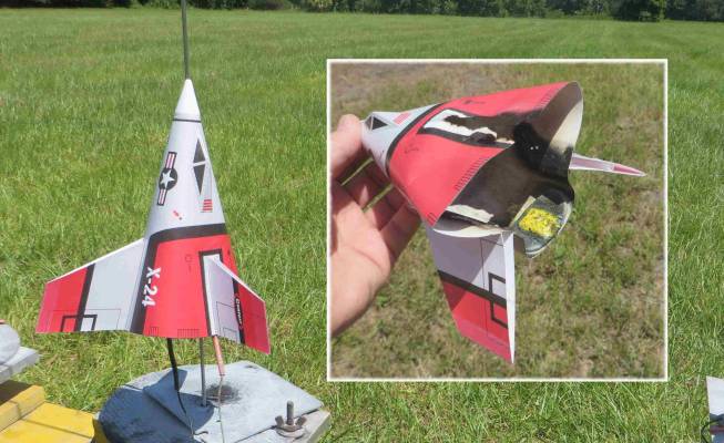 During boost the sides of the body were pulled into the center line engine flame. It's not repairable but I'll salvage the nose cone and weigh the clay for a future attempt.