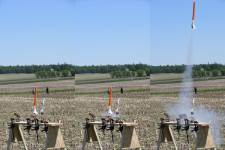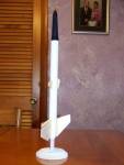 SCRAM 140  Flight It turned in a nearly perfect vertical flight before suffering a shock cord failure on deployment. The nose cone and streamer were not found, but the body did a perfect lawn dart maneuver, suffering minor damage. A new nose cone and some minor repair will have this one flying again. - A8-3 - ... [More]