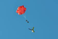 Mo' Skeeter  Flight It was a good flight, weathercocking somewhat, with an excellent deployment; the rocket drifted back over the launch area and landed in the grassy parking area with no evident damage. This is the 21st flight for this rocket, still wearing the same paint job (but with some small battle scars to ... [More]
