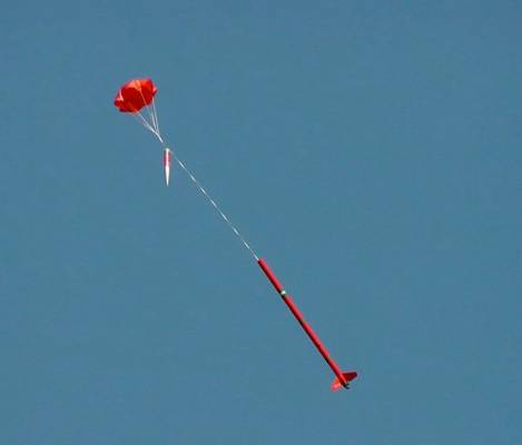 I intend to try to fly this with an under-sized parachute instead of the streamers. I find it easier to pack a quality Nylon 'chute than roll a couple of streamers up, and by varying the diameter, I can get a more controlled descent speed (Aiming for about 15mph.) I flew it with a 12" chute but it came down too slow, so I changed it out for a 9" chute for the next test flight, which also saved 5 grams of weight. I always fly in a large field and the rocket always lands in grass, so I don't expect broken fins.