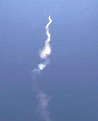 As the upper stage disappears, the booster can be seen in shillouette falling back to the ground