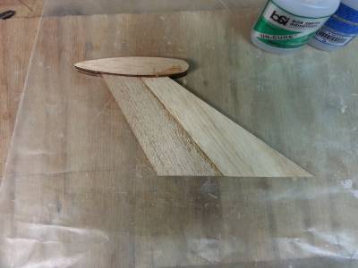 There are three long wood pieces that are to be glued together. This unit will hold the vertical stabilizer and wing against the fuselage. I stacked them and sanded all the laser nastiness off of them before applying the CA. I rounded off the front as per the instructions but I also rounded the edges of the top for cosmetic reasons. Sanded sealed X4. Finally I attached the vertical fin/tail cone.