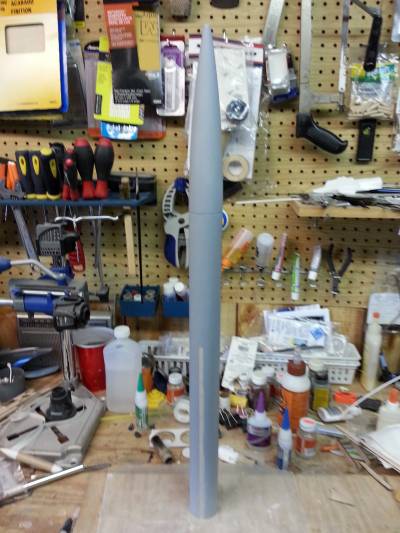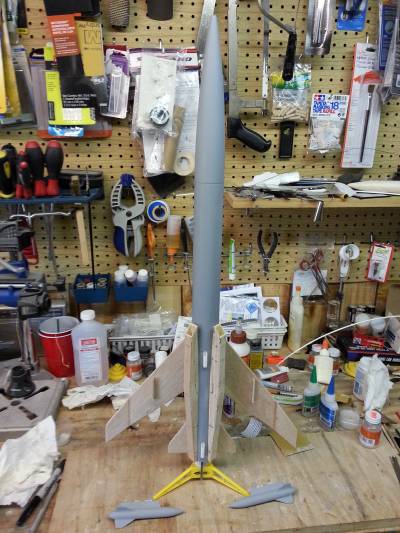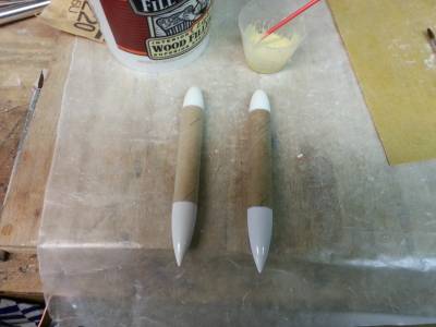 The rear fins were rounded on the leading edges and tapered on the trailing edge. I scraped the primer away to expose the body tube and the fins were attached with medium CA. I finished up with some wood glue fillets.
