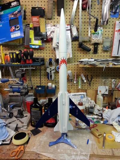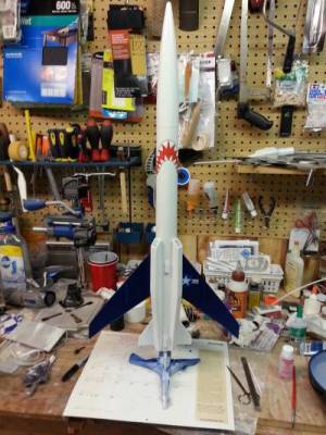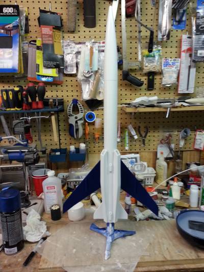 If you look at the web photo of this rocket it appears that it is painted with a white/violet-blue paint job. Before I received this kit I went to my LHS to peruse paints and not seeing anything that matched was told that I should start mixing. Right! After getting my kit the facecard indicated more of a metallic blue and white finish. This was more in the realm of possibilities. I chose to do this in lacquer as it is fast drying and easier to polish than enamel. Rustoleum white lacquer and Duplicolor "Ocean Blue Metal Specks" fit the bill. Although the Duplicolor instructions would lead you to believe it is an enamel it is actually an acrylic lacquer. I have had a lot of experience with "Metal Specks" and it will take a lacquer clearcoat beautifully. I started with the white without any heavy masking involved. A plastic bag covered the wings while I coated the belly of the beast. Masking for the blue was much more involved. This paint scheme is apparently based on the Regulus II which has wings down the center line. The top is blue and the bottom white following the paint lines. I decided to paint both sides of the wing blue as they are above the center paint line on this rocket. The rear wings/fins are blue on top and white on the bottom. The facecard seems to indicate this scheme but to each their own I suppose. Tamiya tape here was a must. I did use the "blue tape" in non-critical areas. The blue covered quite evenly although much attention must be paid to the narrow spaces under the wings and all trailing edges. Wet sanding the white is fine while wet sanding the metallic blue is a no-no.